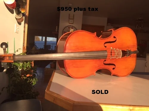 SOLD This is a great cello for the price. It's an Amati model from 2009. I played a cello at a music store in the local mall that was $1700 and it was plywood. This is solid spruce and maple and sounds 20 times better than the mall cello IMHO. Comes with bow and fabric backpack style case. Super deal.