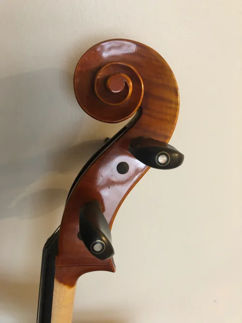 5 String with low F string (Could be strung with High E). Sometimes you just need those lower notes! Because I was concerned with the added tension of a 5th string, I modified this cello by removing the fingerboard and inlaying two carbon fiber bars to reinforce the neck.
